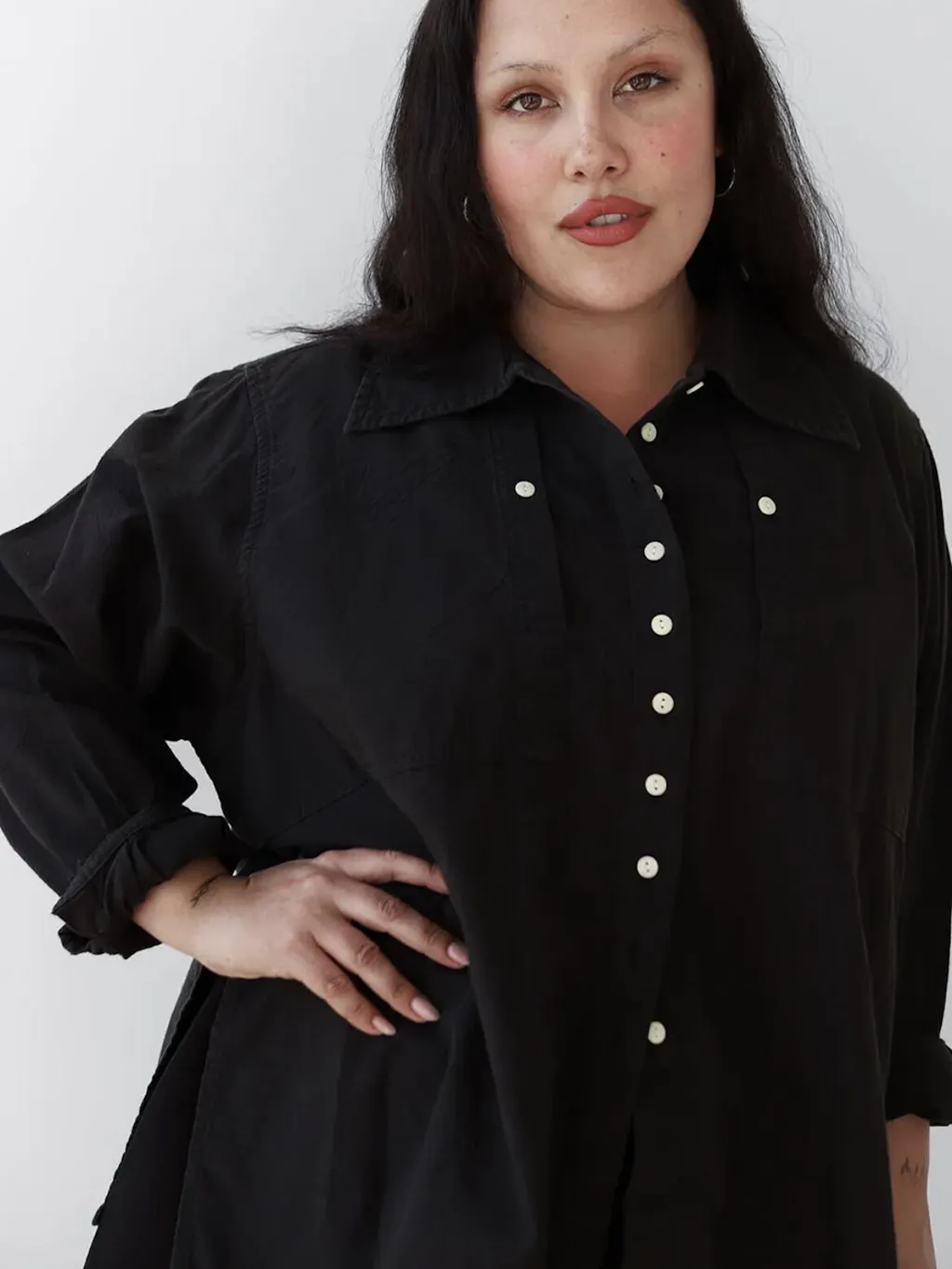 Dare we say "the most comfortable collared top you've ever rocked?" Made from 100% organic cotton crepe. The fit is boxy and oversized with 2 sexy slits on the side for breathability, 9 petite coconut buttons on the front for a feminine touch, and 2 oversized chest pockets to slide all your ish in.